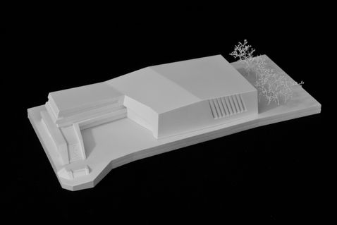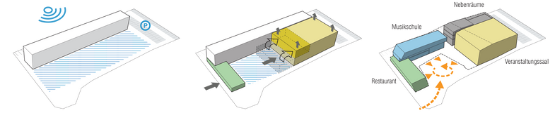 Der Baukörper bildet einen schützenden Rücken zur dahinterliegenden Bahntrasse. Um die Verbindung zum öffentlichen Raum nicht zu blockieren, werden alle Parkplätze auf die Rückseite des Gebäudes gelegt. Die Platzgestaltung am Kopf des Grundstückes nutzt den Niveausprung gestalterisch aus, grenzt den Platz ab und bildet eine markante Adresse an der Langenharterstrasse. Die einzelnen Funktionen wenden sich alle dem neu geschaffenen Platz zu und machen diesen zu einem belebten städtischen Aufenthaltsort. Im Inneren bleiben die Einheiten funktional voneinander abtrennbar, sind aber räumlich alle miteinander verbunden. Diese enge Vernetzung prägt den Geist eines neuen Zentrums für Musikkultur, in dem ein starker Austausch zwischen den Bereichen stattfinden kann und in dem sich vielseitige Nutzungsszenarien eröffnen.